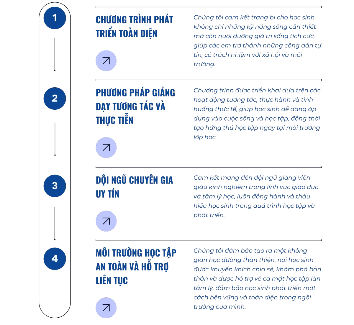 Chúng tôi hiểu rằng mỗi học sinh đều cần được trang bị những kỹ năng sống thiết yếu để tự tin bước vào cuộc sống hiện đại và hội nhập quốc tế. Với sự thấu hiểu và đồng hành tận tâm, Happy Life mong muốn giúp các con khám phá được tiềm năng của chính mình, phát triển toàn diện cả về trí tuệ lẫn tinh thần, vững vàng đối mặt với thách thức để từ đó trở thành những công dân toàn cầu đầy trách nhiệm và yêu thương.